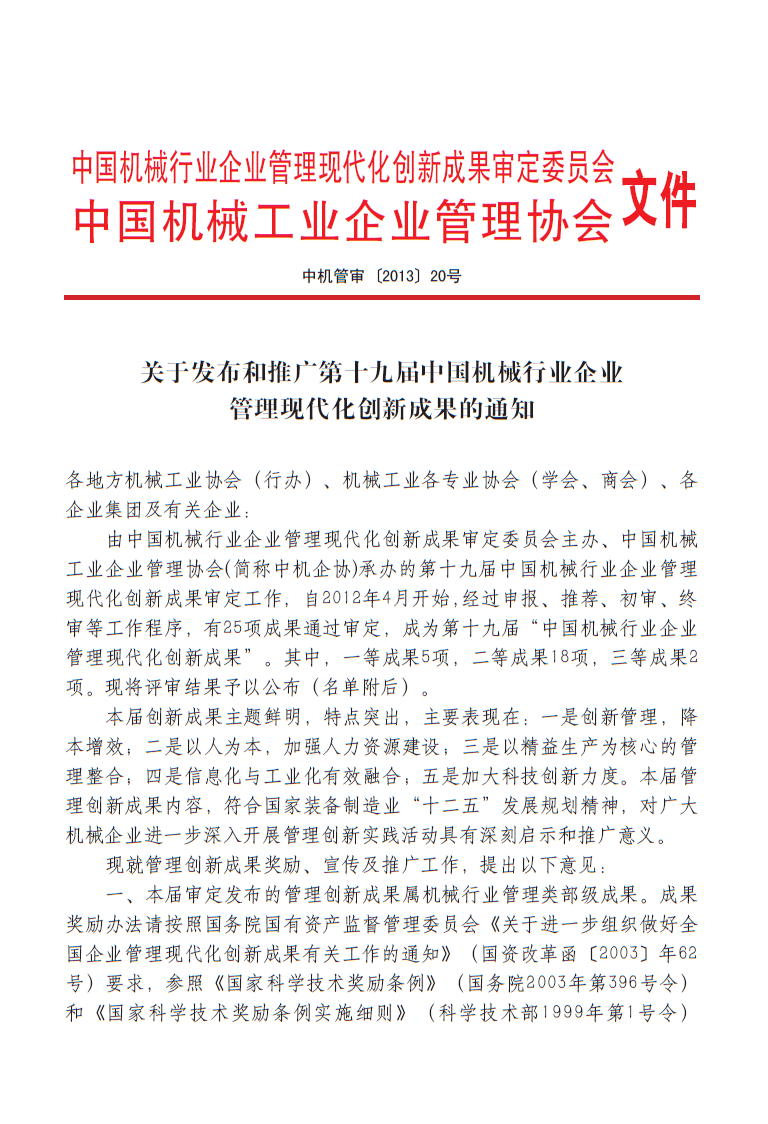 關(guān)于發(fā)布和推廣第十九屆中國機(jī)械行業(yè)企業(yè)管理現(xiàn)代化成果的通知
