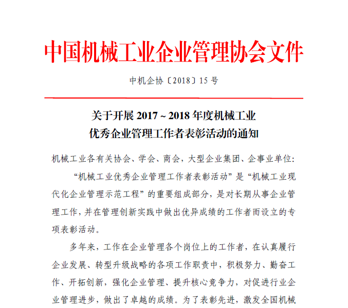 關于開展2017~2018年度機械工業(yè)優(yōu)秀企業(yè)管理工作者表彰活動的通知