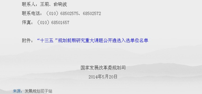 4月23日,我委召開新聞發(fā)布會(huì),公布“十三五”規(guī)劃前期研究重大課題遴選公告,向社會(huì)公開遴選研究單位。本次遴選活動(dòng)得到了科研單位、高等院校等研究機(jī)構(gòu)的積極響應(yīng)和大力支持。截至5月5日(以郵戳為準(zhǔn)),共收到265份課題申請(qǐng)書。經(jīng)專家嚴(yán)格評(píng)審,現(xiàn)將擬承擔(dān)重大課題研究的27家單位予以公告(具體名單附后)。