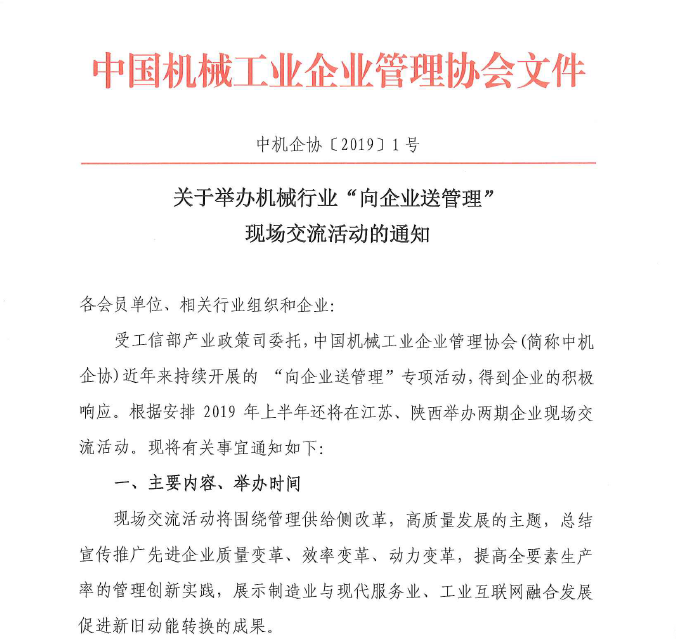 關于舉辦機械行業(yè)“向企業(yè)送管理”現(xiàn)場交流活動的通知 中機企協(xié)〔2019〕1號.pdf