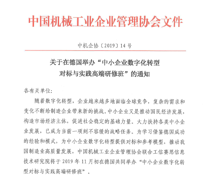 關(guān)于在德國(guó)舉辦“中小企業(yè)數(shù)字化轉(zhuǎn)型對(duì)標(biāo)與實(shí)踐高端研修班”的通知-中機(jī)企協(xié)〔2019〕14號(hào).pdf