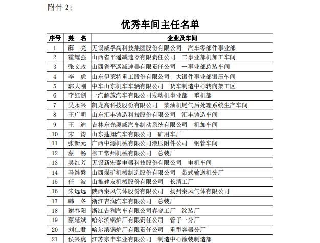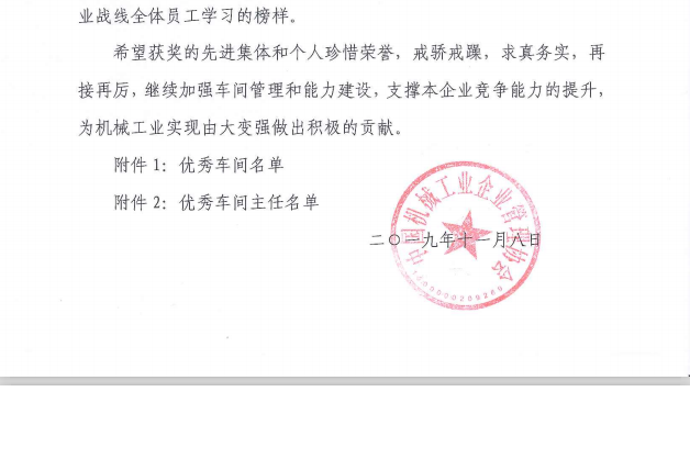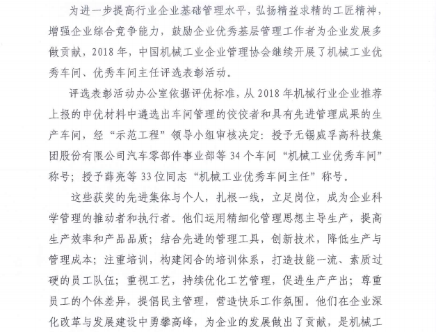 關(guān)于表彰2018年機(jī)械工業(yè)優(yōu)秀車間、優(yōu)秀車間主任的決定