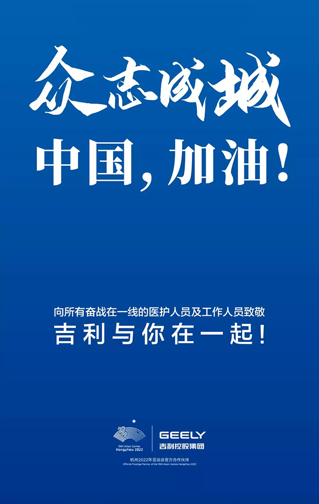 眾志成城,中國(guó)加油!所有吉利人都在隨時(shí)關(guān)注疫情發(fā)展,結(jié)合吉利控股集團(tuán)的全球產(chǎn)業(yè)資源,隨時(shí)為戰(zhàn)勝疫情獻(xiàn)上吉利人的微薄之力。